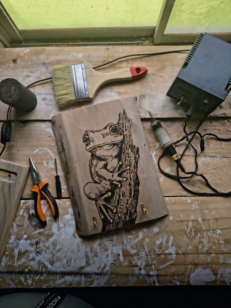 La imagen detallada de la rana arbórea posada en una rama no es una impresión mecánica. Está creada mediante pirograbado artesanal. Esta técnica milenaria consiste en grabar la madera aplicando calor con una herramienta de metal. Cada línea del dibujo es el resultado de la presión y la temperatura controladas por la mano de un artista, creando una textura y una profundidad que ninguna máquina puede replicar. Es arte, puro y simple, puesto al servicio de la función.