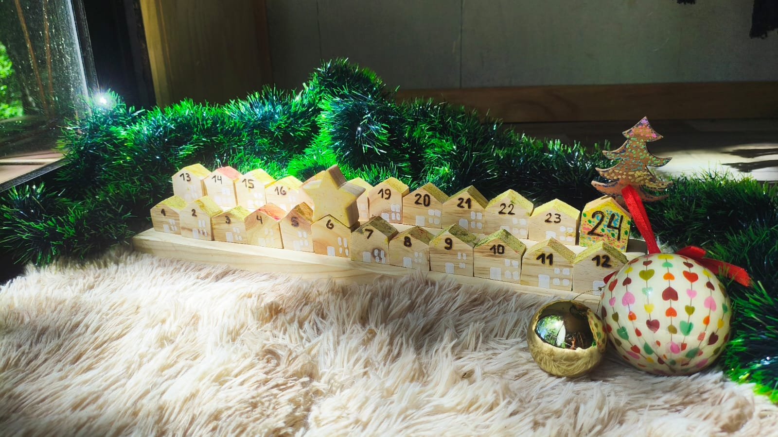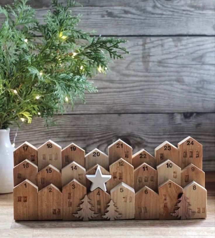 24 casitas de madera con base y estrella para marcar el día.Puedes pasar un momento entretenido con tus hijos mientras personalizan las casitas y le dan vida a este pequeño pueblo navideño.